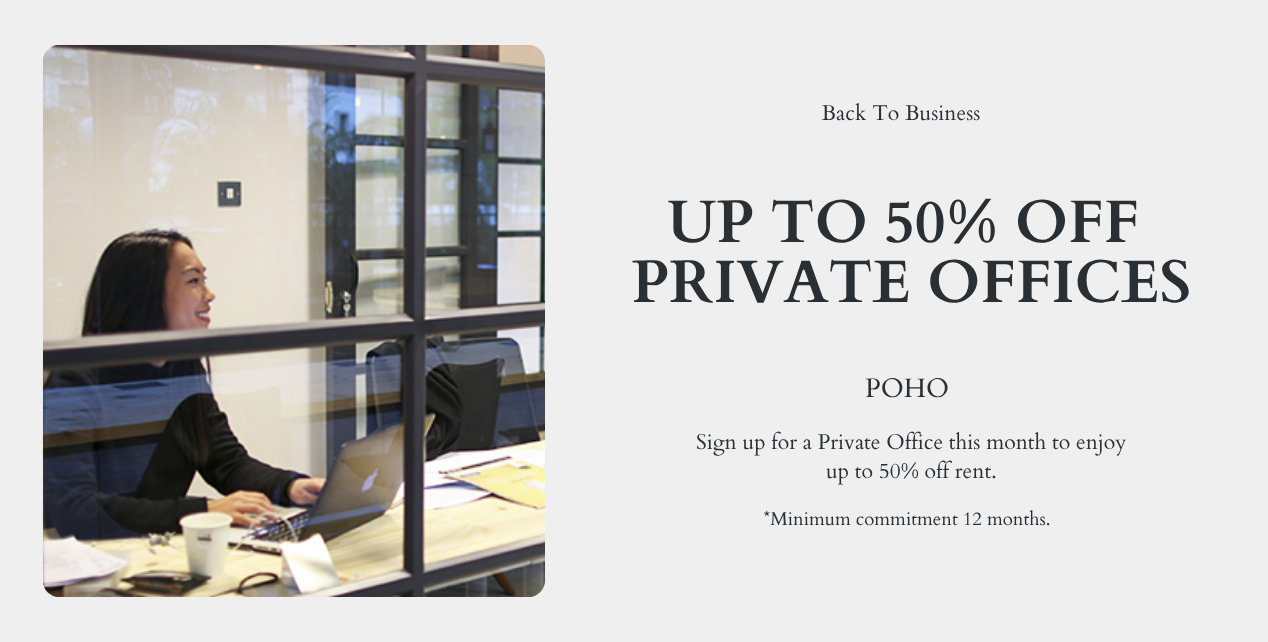 Sign up for a Private Office this month to enjoy up to 50% off rent.