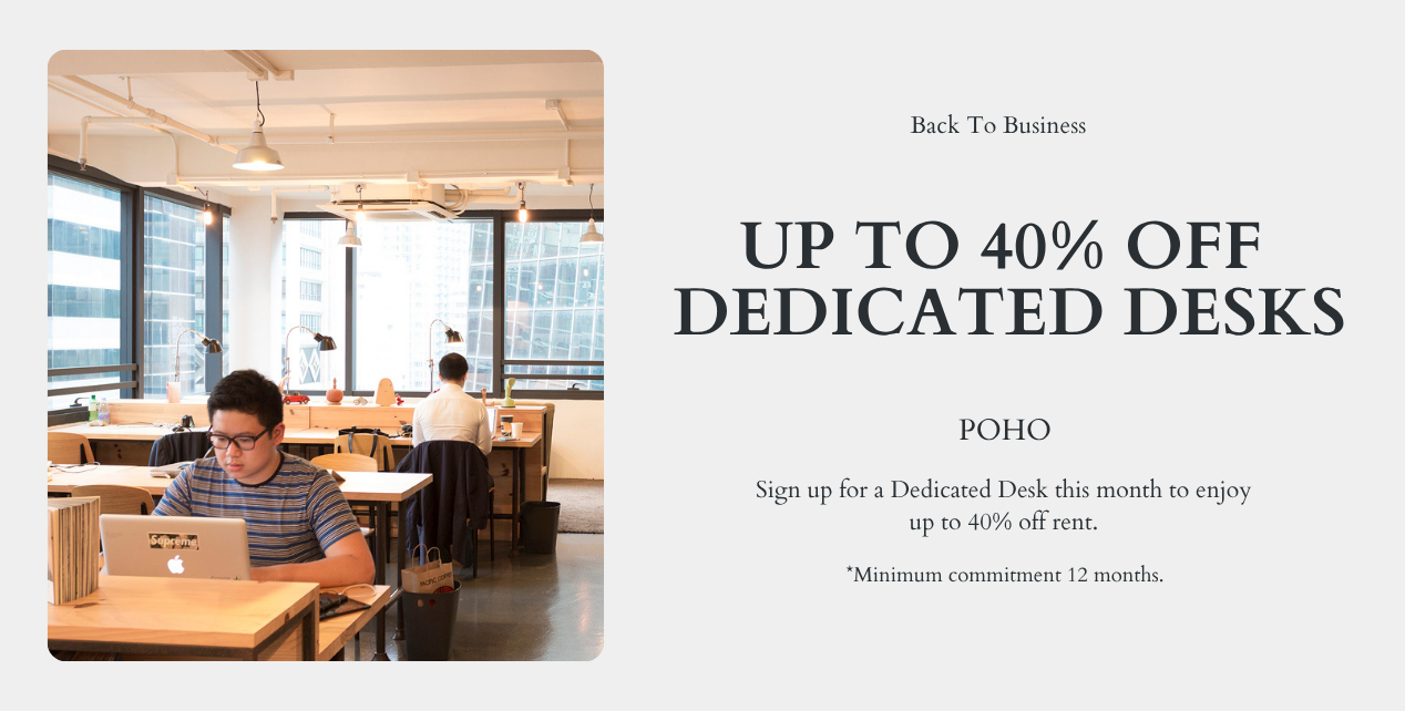 Sign up for a Dedicated Desk this month to enjoy up to 40% off rent.